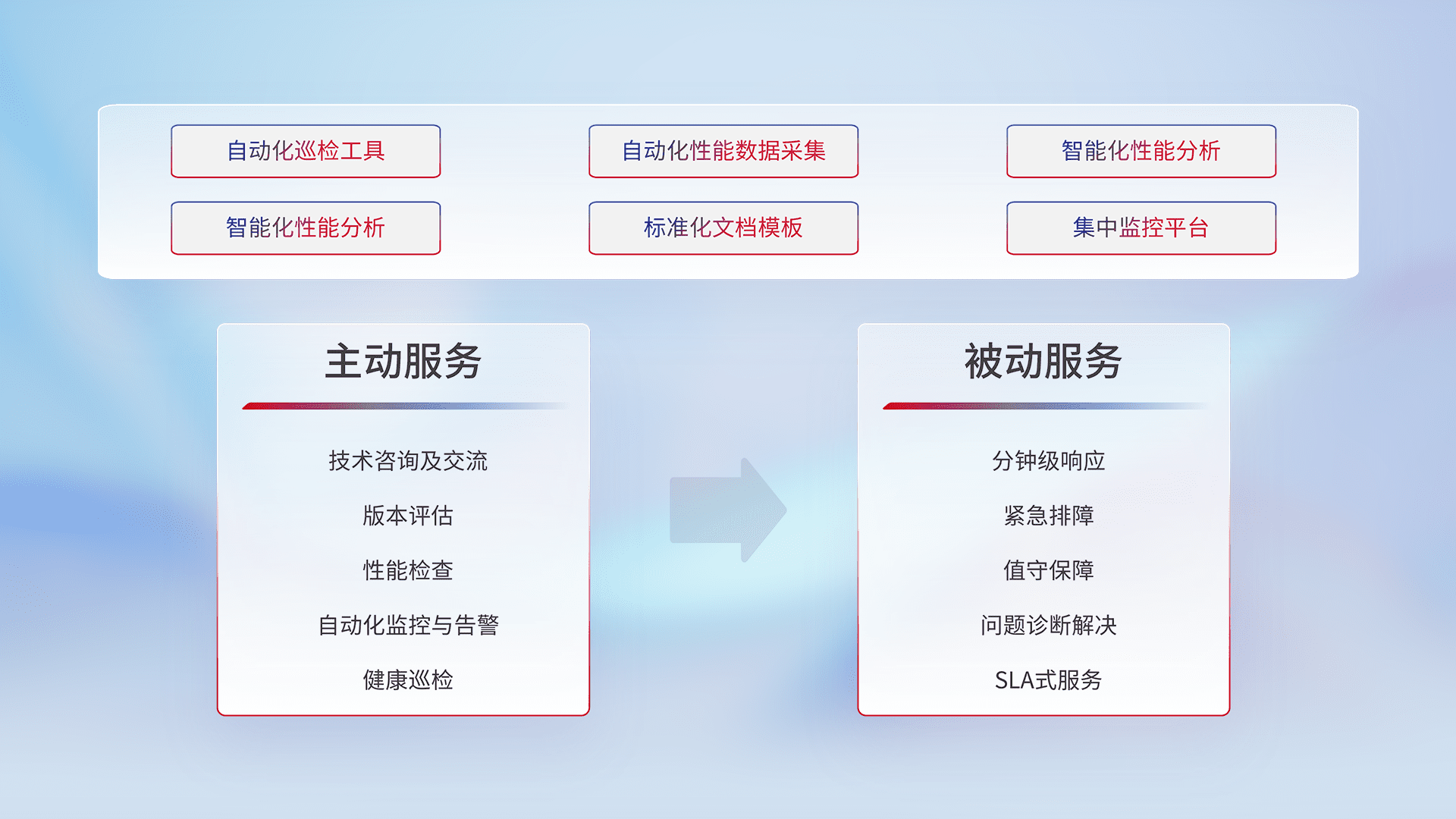 智能化工具和标准化文档,,,,保障服务质量,,,,提供主动服务(包含技术咨询、、、、版本评估、、、、性能检查、、自动化监控与告警、、、健康巡检)和被动服务包含(分钟级响应、、紧急排障、、、值守保障、、、、问题诊断解决、、、SLA服务)。。。